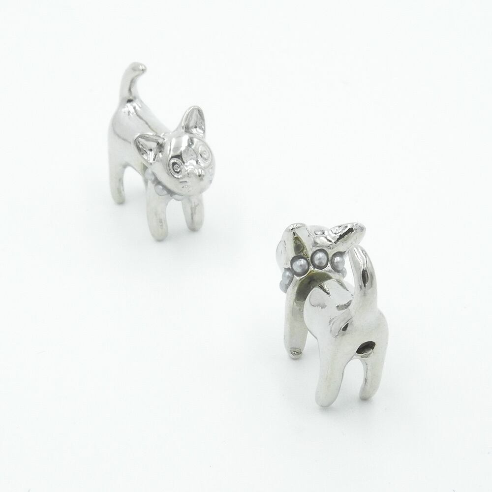 愛らしい猫の胴体が真ん中でセパレートされており、装着すると耳を突き抜けるように見えます。ユニークで目を引くスタイルが魅力的です。