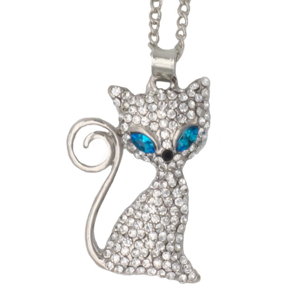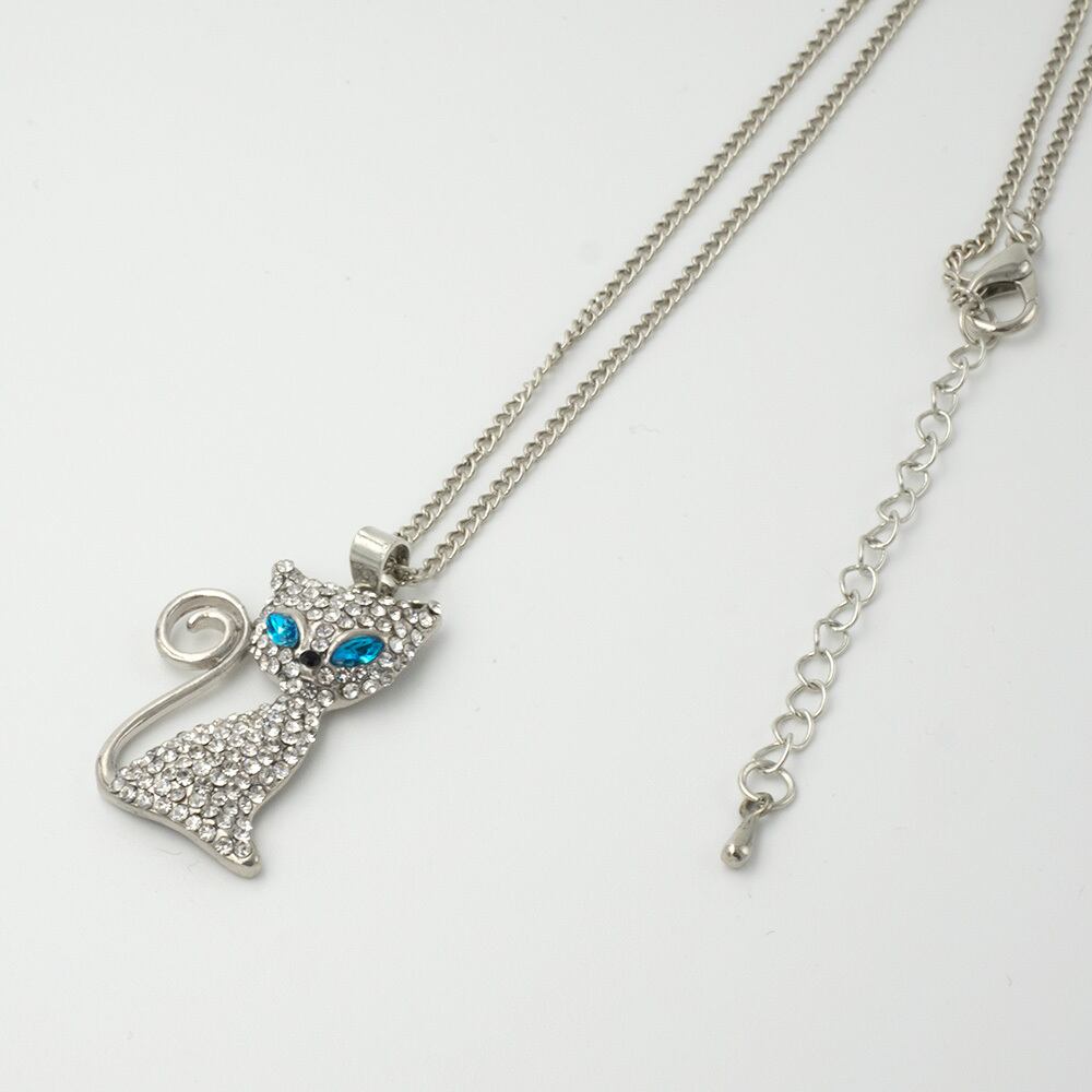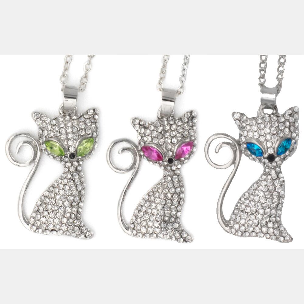 細かいクリスタルがあしらわれた猫型ペンダントです。 目の色の石が3色。どの色がお好きですか? 長さ ・ラバーチェーン45cm ※合金製