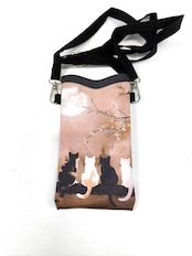 月を見上げる4匹の猫さんがあしらわれたスマホポーチです。 ストラップは首かけ肩掛けなどでご使用できるよう調節が可能です。 フェイクレザープリント